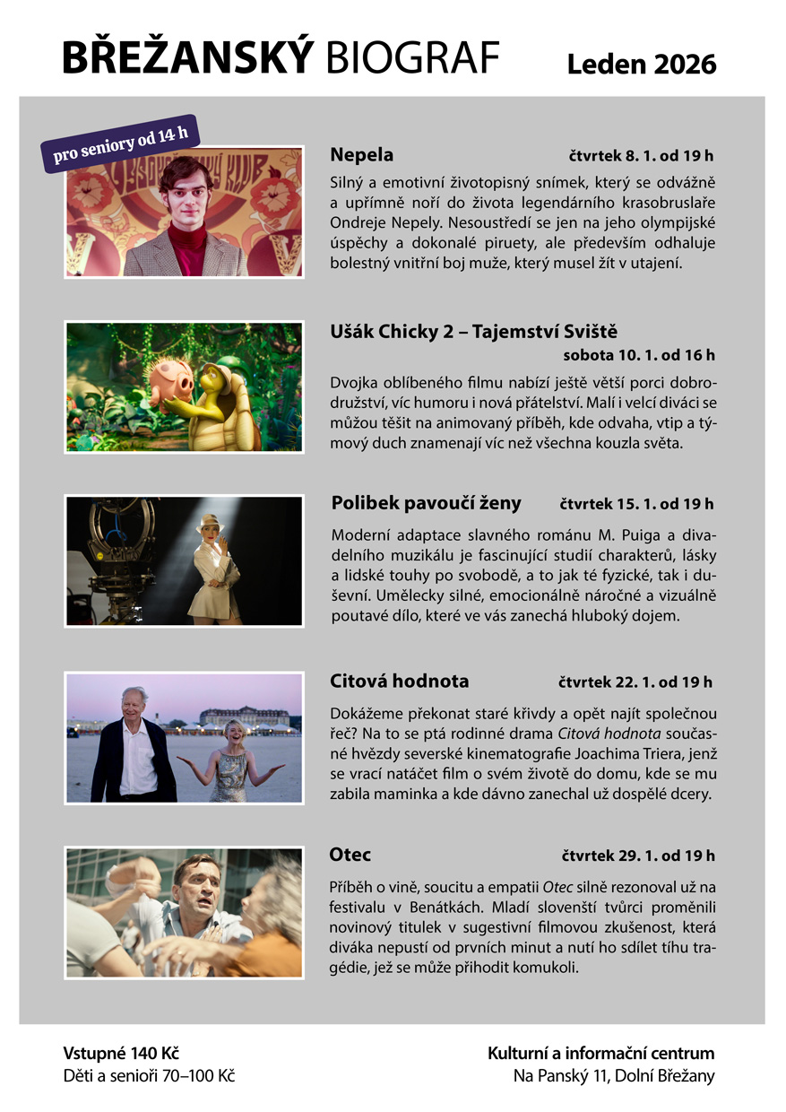 Představujeme vám filmy, které jsme pro vás vybrali pro první měsíc nového roku: životopisný snímek Nepela, animovaný příběh pro děti Ušák Chicky 2 a tajemství sviště, adaptaci slavného románu Polibek pavoučí ženy, rodinné drama Citová hodnota a příběh o vině, soucitu a empatii Otec. Přejeme vám krásné Vánoce a v lednu se na vás v našem biografu budeme opět těšit..jpg)